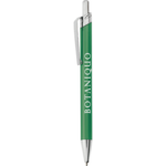 The Cromwell Metal Pen has a retractable ballpoint with anodized aluminum barrel and shiny chrome accents. Black ink cartridge.