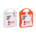 The MyKit™ 21-Piece First Aid Kit is a hard plastic travel case with safety seal label that includes: 12 waterproof adhesive bandages, 4 antiseptic swabs, 2 dry swabs, 1 elastic bandage roll and 2 burn wound lint pads. Decoration applied directly on white label. Meets FDA requirements. Available in Canada.
